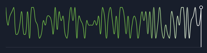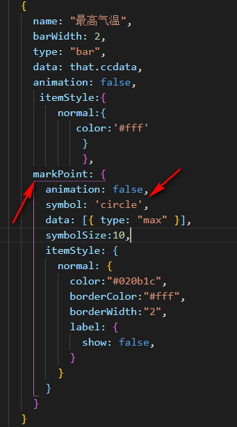 该部分是基于echarts开发的,主要有两部分组成,折线图和柱状图,其中末端的垂直细线和小圆球为柱状图部分,小球是柱状图的markPoint设置的,柱状图的data数据是与折线图data数据数组长度相同的数组,数组最后一项与折线图数组的最后一项等值,其余项均为0,具体配置如下: