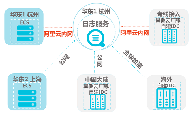 阿里云内网为千兆共享网络,日志数据通过阿里云内网传输比公网传输更快速、稳定,且不消耗公网带宽。