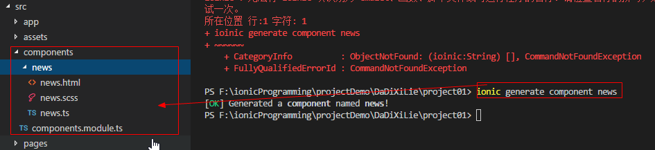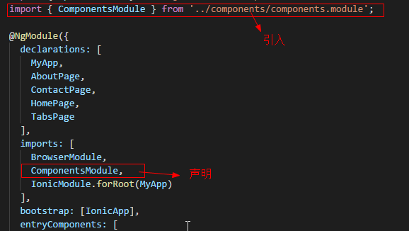 技巧01:和angular中使用组件的方式一样,只要在相应模块中引入并声明后就可以使用了【PS: 本博文直接将需要使用组件所在的模块引入的】