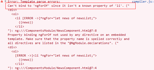 在新创建的组件中直接使用angular相关的指令时会报错,例如:使用*ngFor指令的错误信息如下 ,意思是:li命令没有*ngFor这个属性