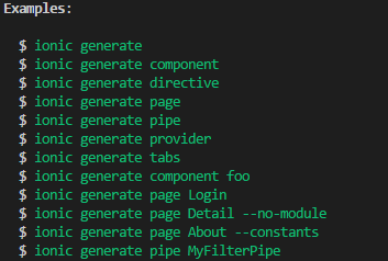 技巧01:在项目根目录下执行相关命令可以查看ionic支持创建哪些命令