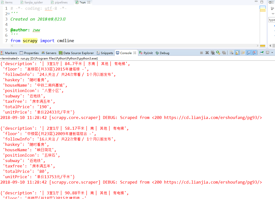 - LianJiaScrapy/pipelines.py:项目中的pipelines文件,抓取后的数据通过这个文件进行处理。(比如我把数据写到数据库里面就是在这里操作的)