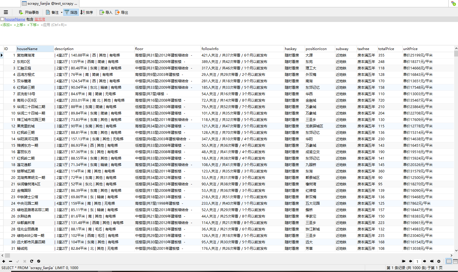 1、目的:通过爬取成都链家的二手房信息,主要包含小区名,小区周边环境,小区楼层以及价格等信息。并且把这些信息写入mysql。