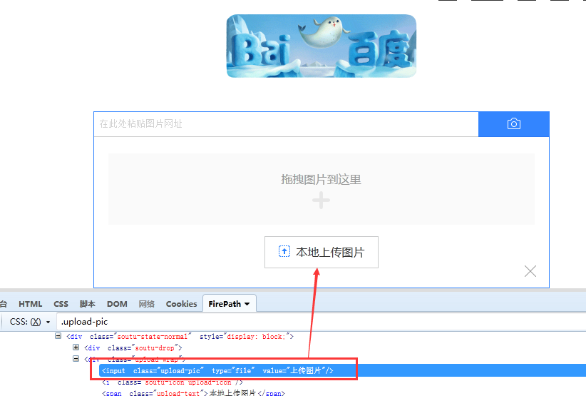 2.用firebug查看按钮属性,这种上传图片按钮有个很明显的标识,它是一个input标签,并且type属性的值为file。