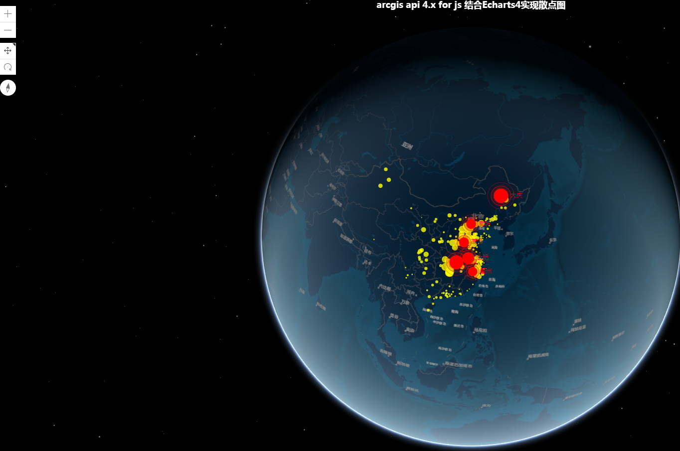 参照 arcgis api 4.x for js 集成 Echarts4 实现模拟迁徙图效果基础上,实现散点图效果,效果图如下:
