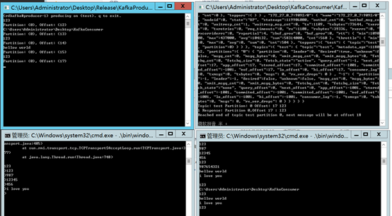 运行后得到如下效果,以下四个框分别是.net生产者,控制台生产者,.net消费者,控制台消费者。