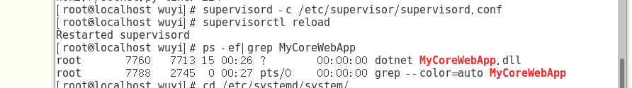 [root@localhost wuyi]# ps -ef|grep MyCoreWebApp