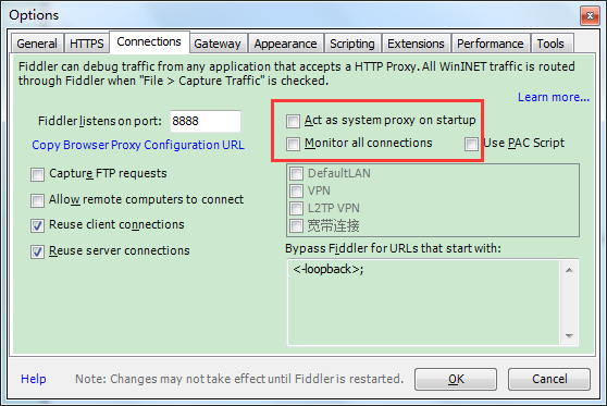 打开 Fiddler --- Tools --- Options --- Connections --- 如下,取消勾选 --- 最后重启 Fiddler
