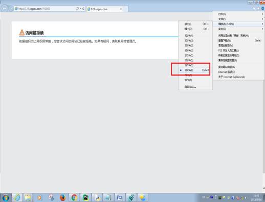 (4) 然后将IE浏览器缩放比例改为100%,如果不是100%缩放,自动化脚本能够打开IE但是不能访问web网页地址,IE也是够坑的~~~