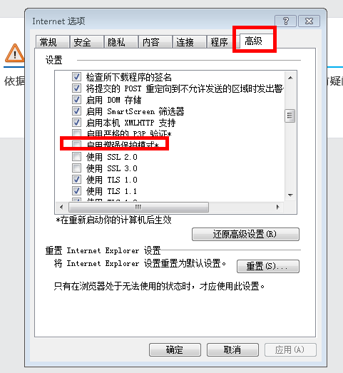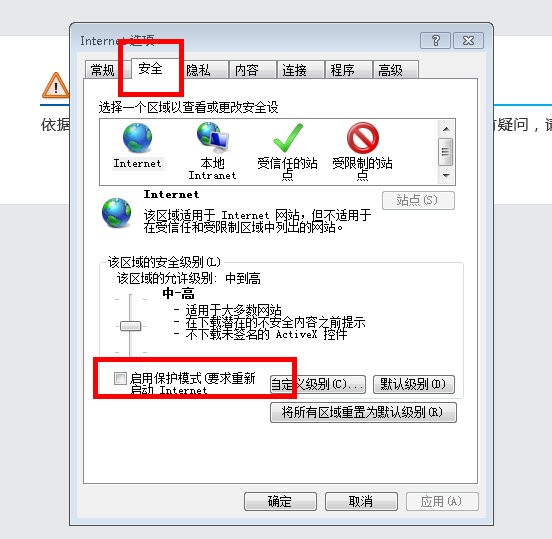 (2) 配置后需要对IE进行安全设置,打开ie进入internet选项中,安全页签的Internet、本地Internet、受信任的站点、受限制的站点的启动保护模式全部去勾选