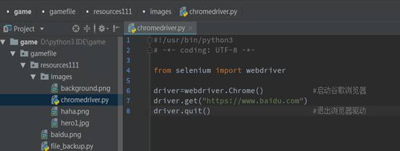 (5) 以上配置好后,我们进入PyCharm中新建chromedriver.py的文件编辑以下代码,验证我们能否启动Chrome浏览器并打开百度网站,并退出浏览器,成功说明我们已经实现安装配置