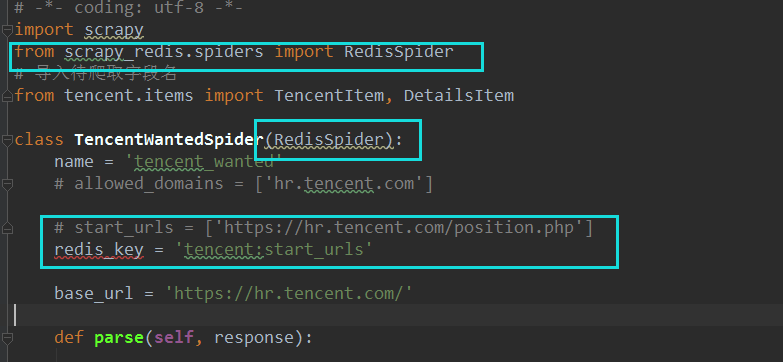 只修改了两个地方,一个是继承类:由scrapy.Spider修改为RedisSpider
