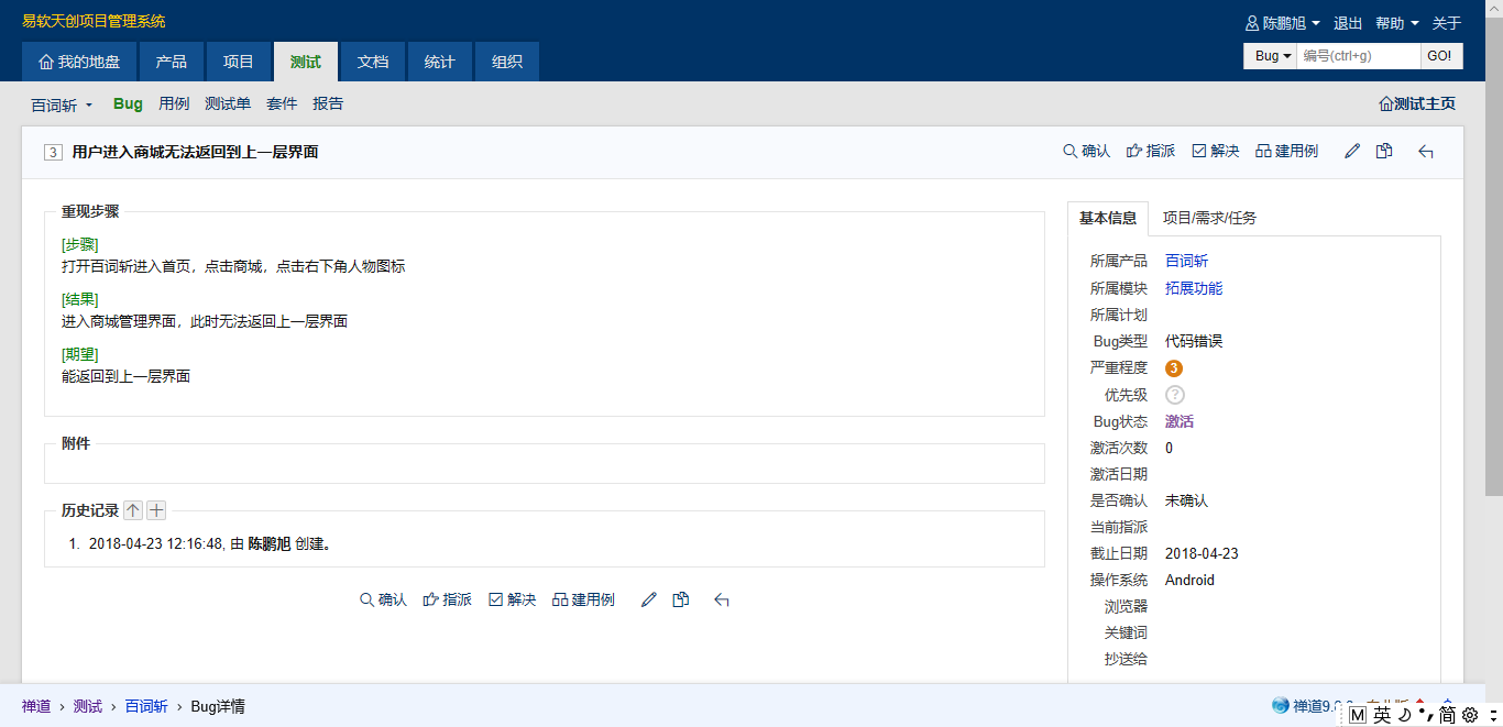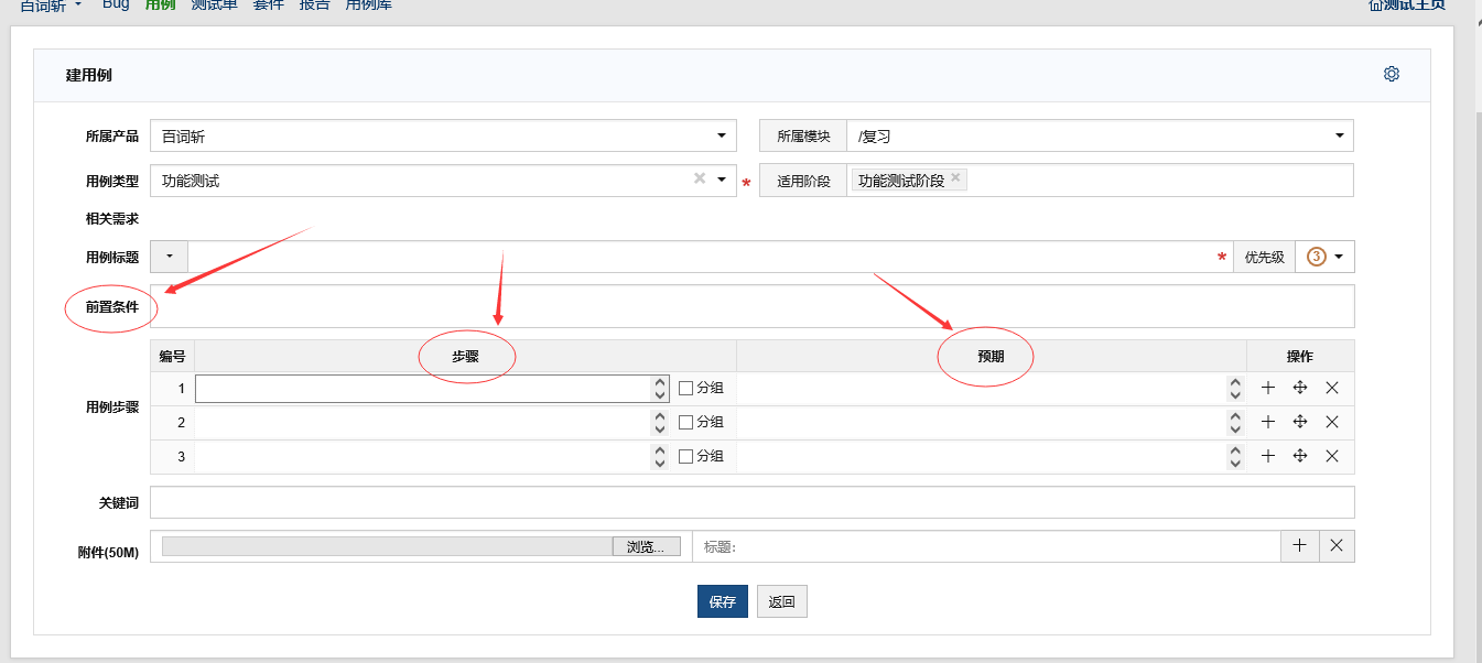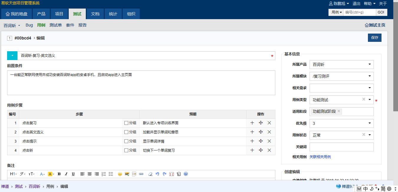 设计思路:给出预置条件,执行指定的操作步骤,获得预期的结果,利用这个思路来测试模块里面的功能是否满足需求。在禅道的测试用例编写界面如下: