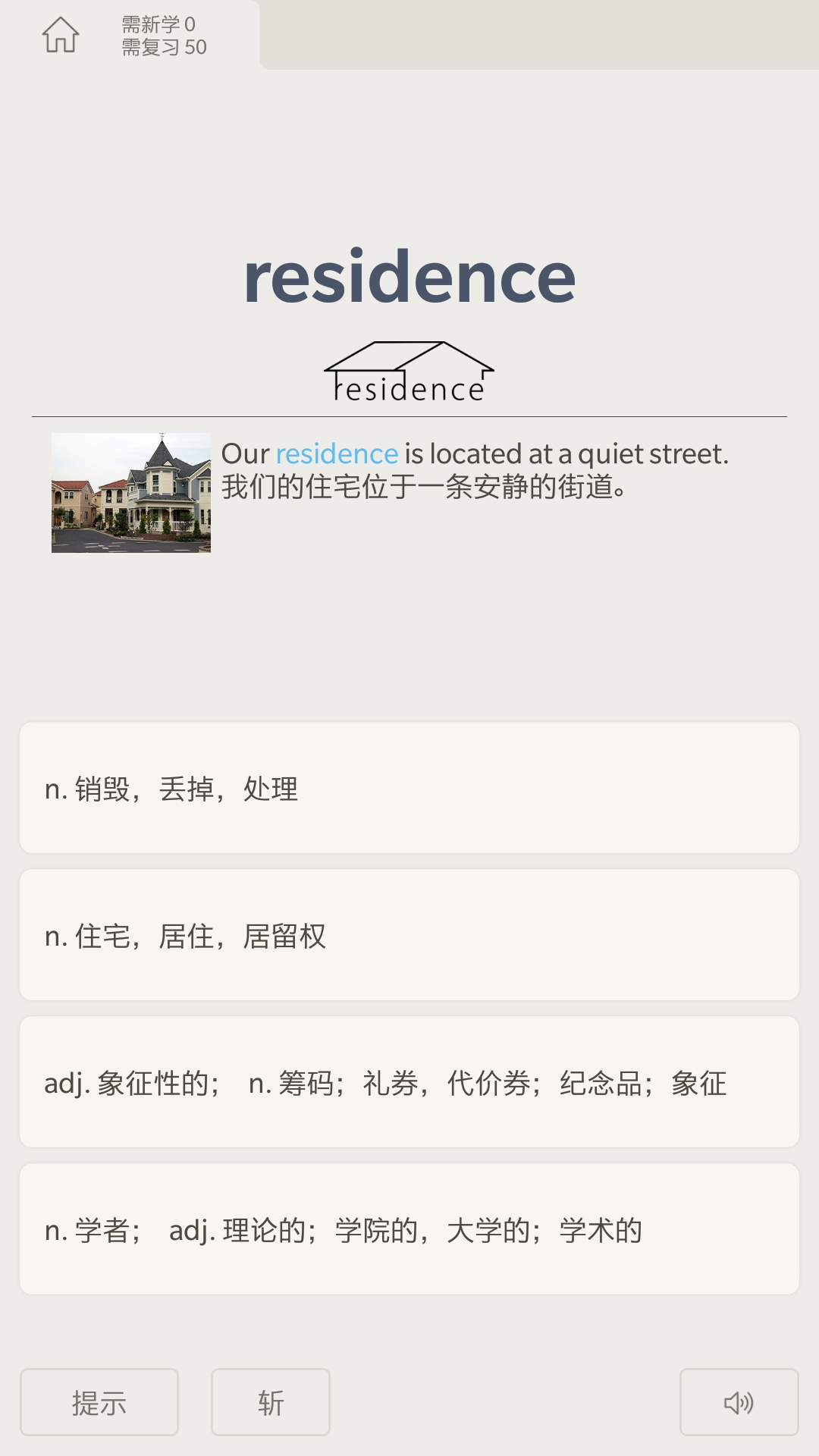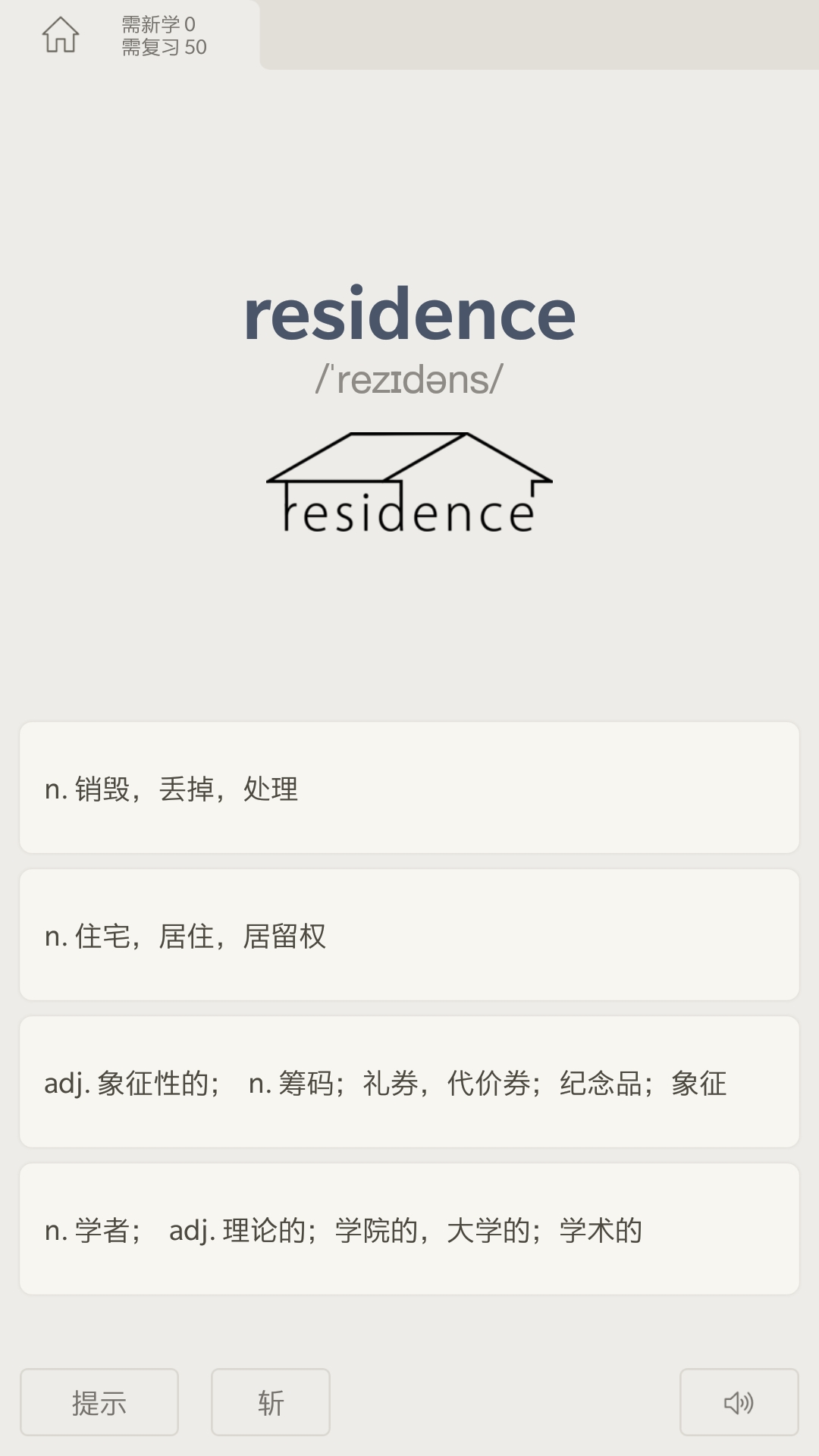 继续点击“提示”->显示详情;继续点击“斩”->切换下一个单词;