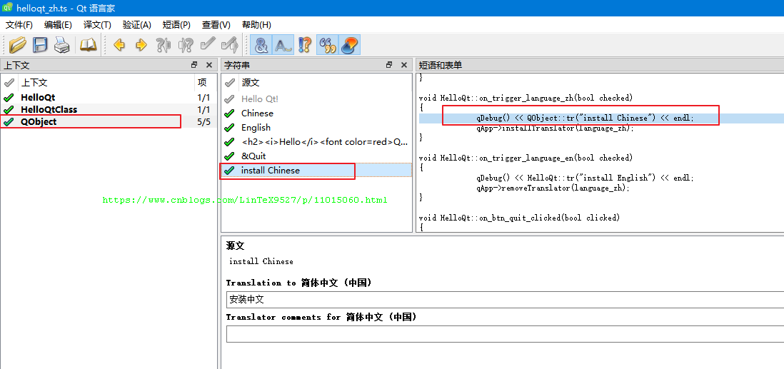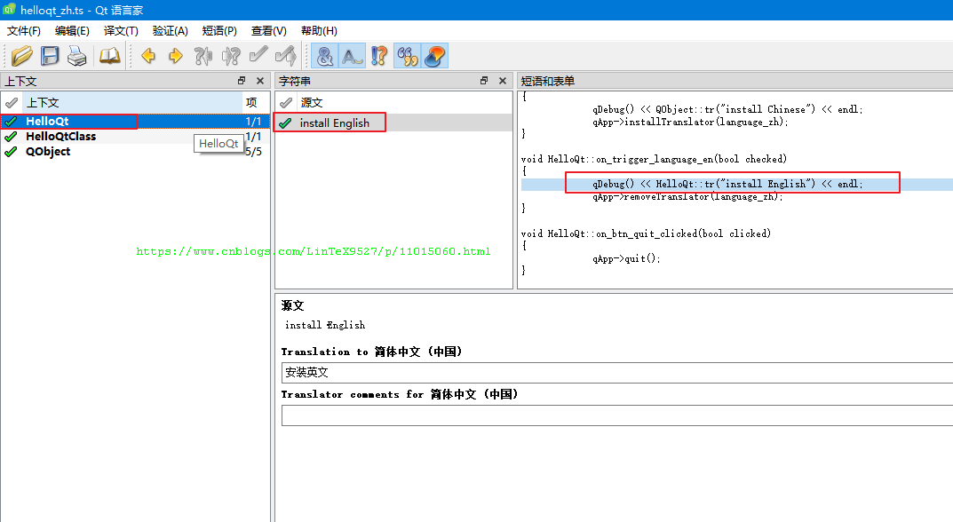 第一个参数 context 理解为上下文,什么是上下文,Qt 助手说它就是一个类名。不同的字符串会分配到不同的上下文。分配规则是 tr() 是用哪个类名来限定的,如下面的代码,分别调用 QObject::tr("install Chinese"),HelloQt::tr("install English") 那么就有两个上下文,分别是 QObject 和 HelloQt,这一点也可以从语言家看到。
