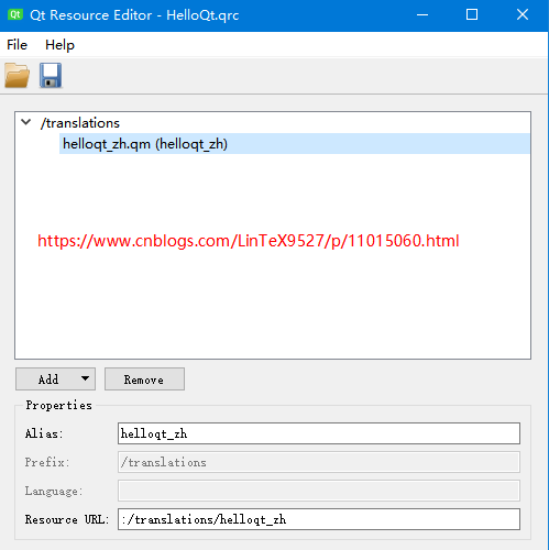 HelloQt.qrc中添加 QM 文件,并把资源重命名为:/translations/helloqt_zh如图所示: