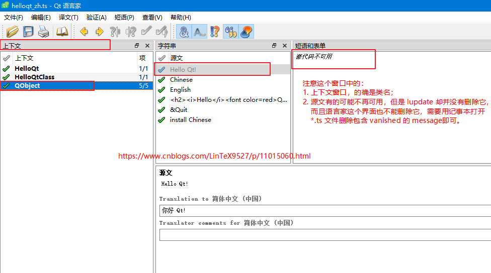 一张图说明上下文,源字符串二者的关系,如果代码中某个字符串被删除了但是 TS 文件中还存在,而且今后不需要这个翻译,就可以用记事本打开 TS 文件,直接删除以 vanished 标记的翻译: