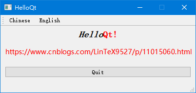 本文示例程序是一个GUI应用,手写布局,在工具栏中添加两个 QAction,可以切换中文、英文界面,主界面一个标签显示文本,一个按钮用来退出应用。