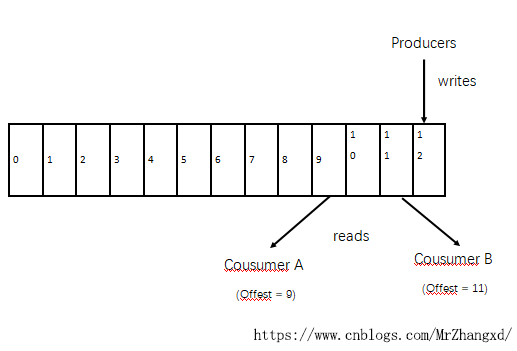 这种方法有一个缺陷——没有办法删除数据 ,所以Kafka是不会删除数据的,它会把所有的数据都保留下来,每个消费者(Consumer)对每个Topic都有一个offset用来表示读取到了第几条数据。