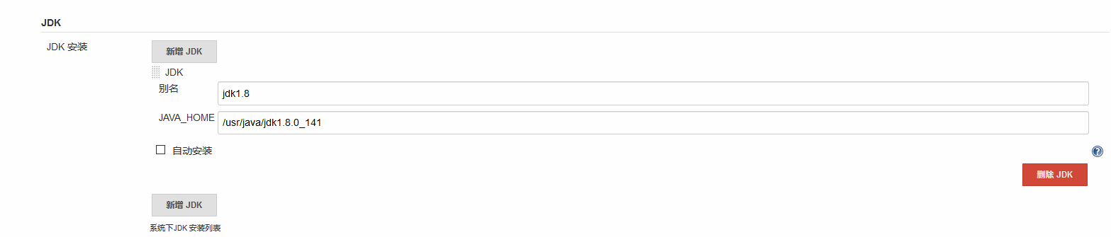 jdk配置如下(JAVA_HOME即为jenkins服务器jdk环境变量的值,如果显示为找不到的话网上百度一下很多资料的)