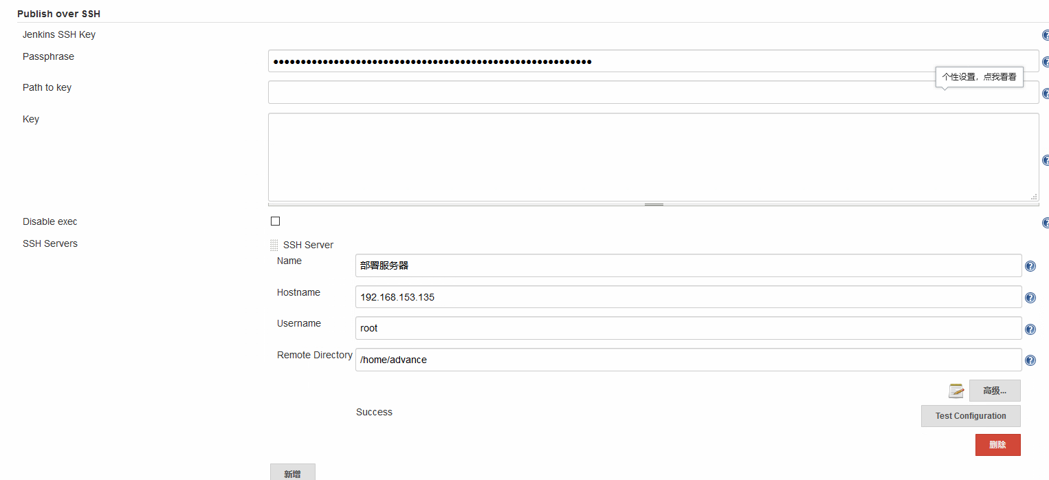 这里最重要的是passphrase、hostname以及username,这三个为远程服务器的登录密码、主机地址以及用户名,name是你在创建任务时选择ssh插件时显示的名字,remote Directory为部署至远程服务器的根目录,点击Test Configuration按钮,下方显示Success则配置成功