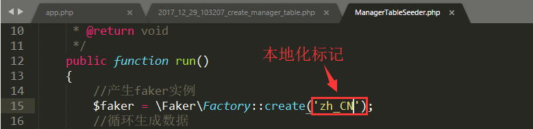 create方法中加入语言包名称:Faker\Factory::create(‘zh_CN’)