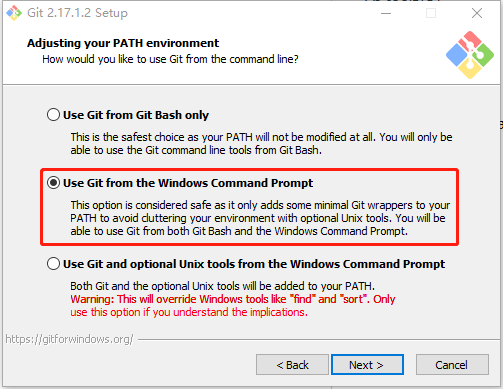2.安装git只有一点注意,根据安装提示把git加入到环境变量(如下图所示),这样可以方便后续直接在控制台中使用git,若是不加也可以,后期可以自己配置。其余可以疯狂的点击next,最后等待安装完毕。