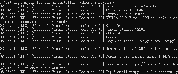 - 完整的目标环境:git,Visual Studio2017(下面简称为VS2017),python,相关依赖(有关深度学习和机器学习)和插件(VS Tools for AI),CUDA与cuDNN
