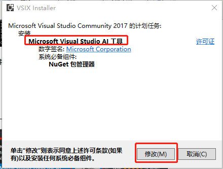 待插件下载完成后(我这里等待了12分钟),关闭VS2017,系统自动安装VS Tools for AI,如下图所示,点击修改,继续等待安装(我这里等待了2分钟),直到出现
