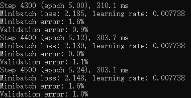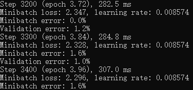 5.每一次的迭代,Minibatch error越来越趋近于0.0%,准确的说是在0.0%边缘徘徊。