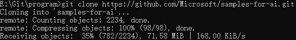 使用git将GitHub上的一个资源(https://github.com/Microsoft/samples-for-ai)克隆到本地,具体操作如下:
