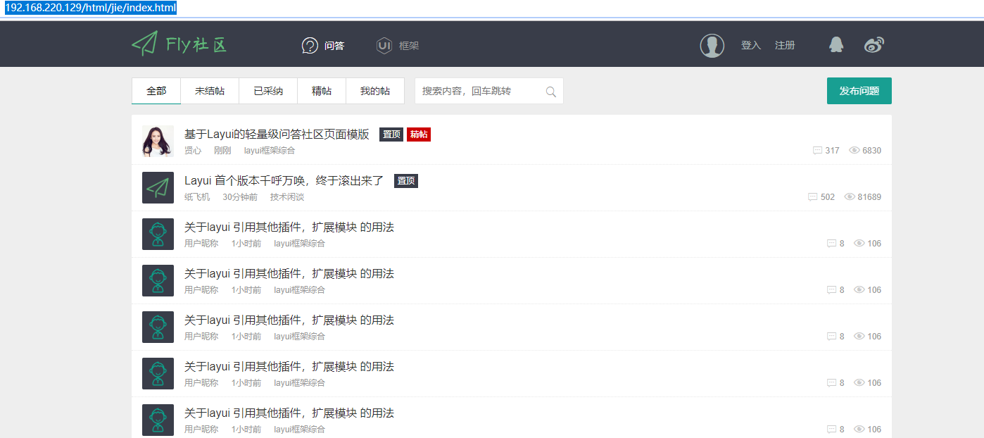这里我以layui的fly模板为例,下载完之后,将文件放到nginx的目录下。