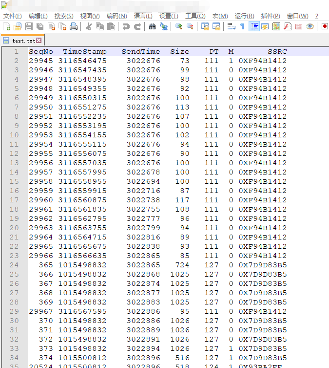 rtp_analyze工具生成的文本文件打印如下,里面包含一些RTP报文头的基本信息。这时我们可以使用ultraedit或者Notepad的列模式,将文本文件转化为csv文件,进行数据分析。