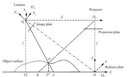 的值,如果相机光轴不和投影仪光轴在参考平面上相交,我们就得不到一个三角形,无法用相似性原理得到物体的高度。