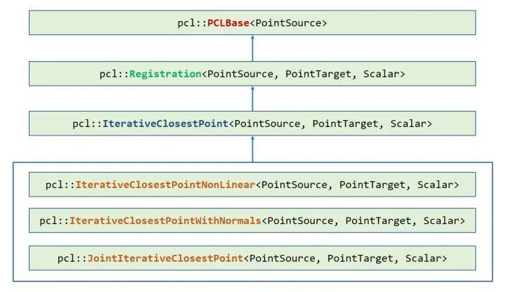 PCL 中的 ICP 是通过Registeration 模板类实现的,其继承关系如下图所示。