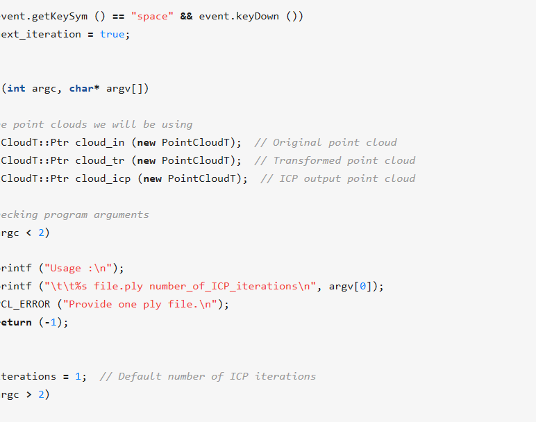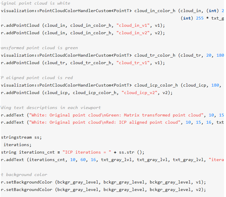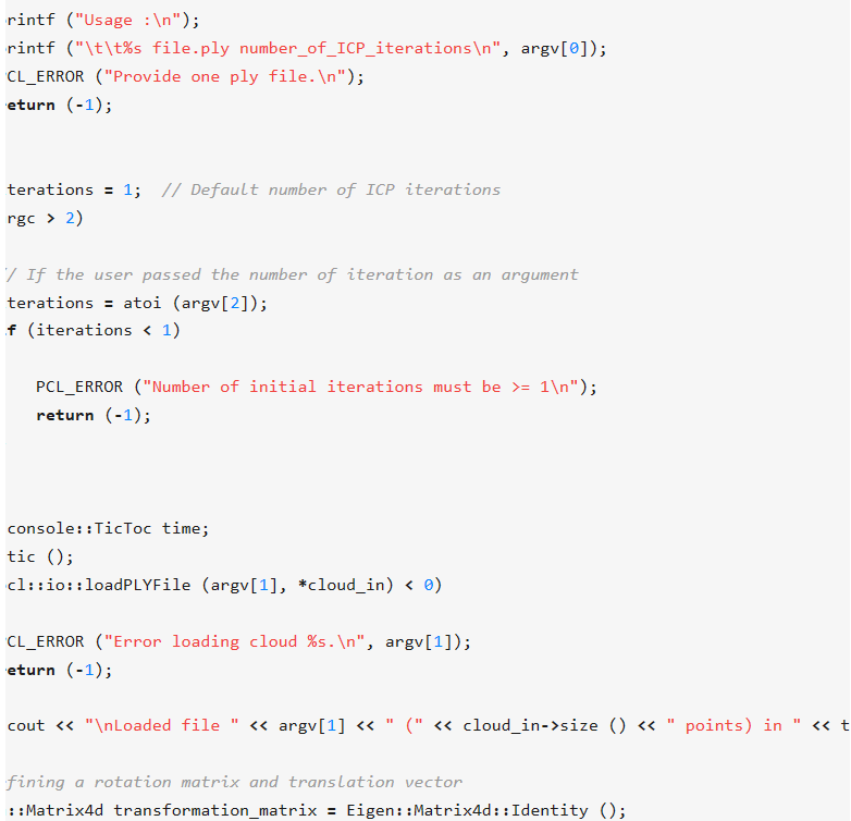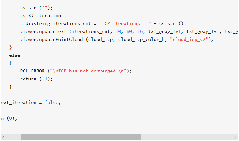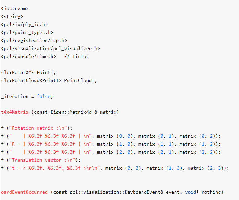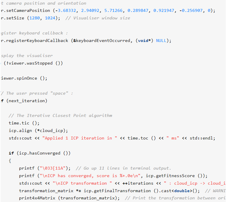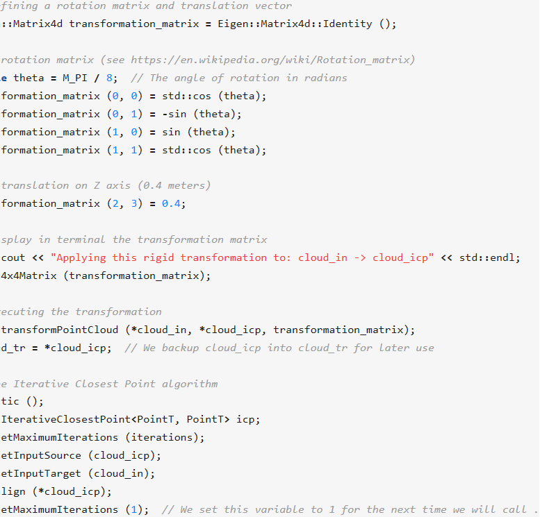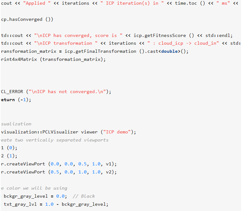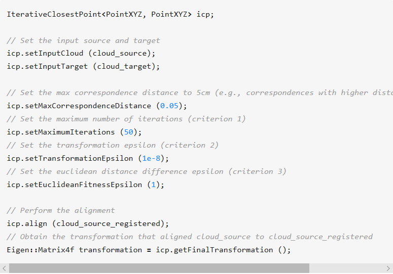 其中,IterativeClosestPoint 模板类是 ICP 算法的一个基本实现,其优化求解方法基于 Singular Value Decomposition (SVD),算法迭代结束条件包括: