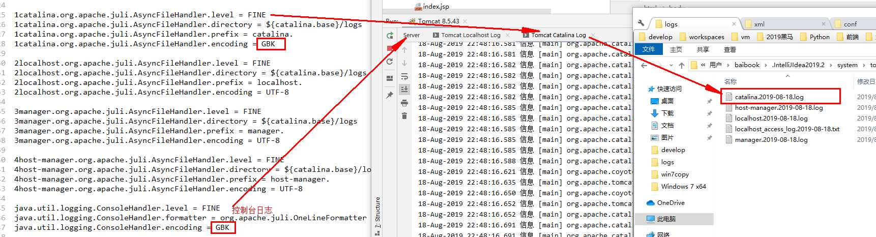 修复乱码方法:只需修改本地tomcat的日志文件logging.properties,将日志中的UTF-8改为GBK