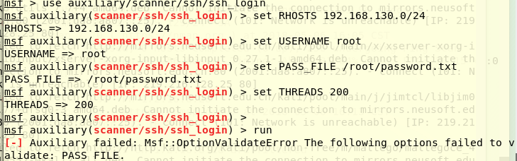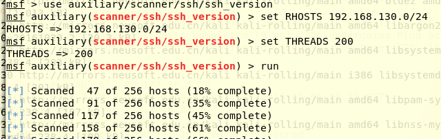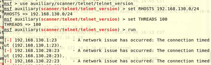 解决过程: 网络上没搜到直接解决的办法,但是透过这个链接: auxiliary/scanner/portscan/syn问题求助,求牛人帮助 我猜想可能是我使用了内网的原因。在连上手机热点之后必须重启才能联网。