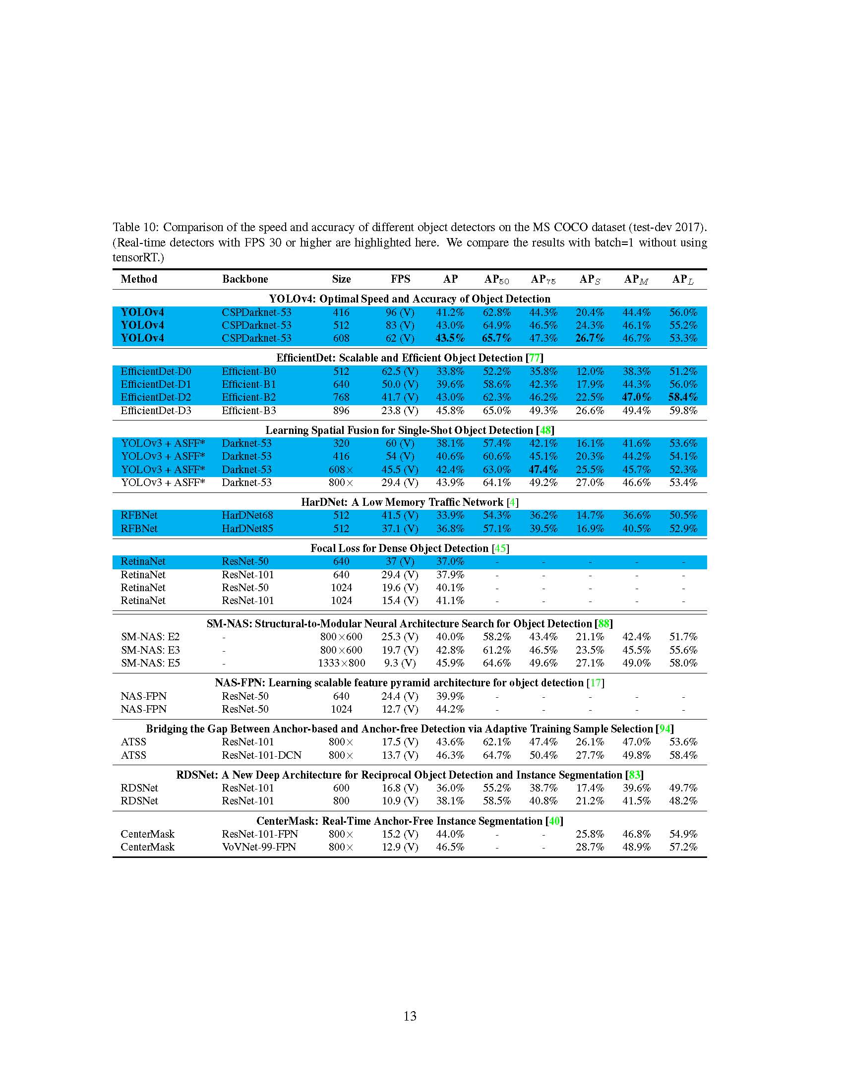 据说有许多功能可以提高卷积神经网络(CNN)的准确性。 需要在大型数据集上对这些特征的组合进行实际测试,并对结果进行理论证明。 某些功能仅在某些模型上运行,并且仅在某些问题上运行,或者仅在小型数据集上运行; 而某些功能(例如批归一化和残差连接)适用于大多数模型,任务和数据集。 我们假设此类通用功能包括加权残差连接(WRC),跨阶段部分连接(CSP),跨小批量标准化(CmBN),自对抗训练(SAT)和Mish激活。 我们使用以下新功能:WRC,CSP,CmBN,SAT,Mish激活,马赛克数据增强,CmBN,DropBlock正则化和CIoU丢失,并结合其中的一些功能来实现最新的结果:43.5%的AP(65.7 在Tesla V100上,MS COCO数据集的实时速度约为65 FPS。