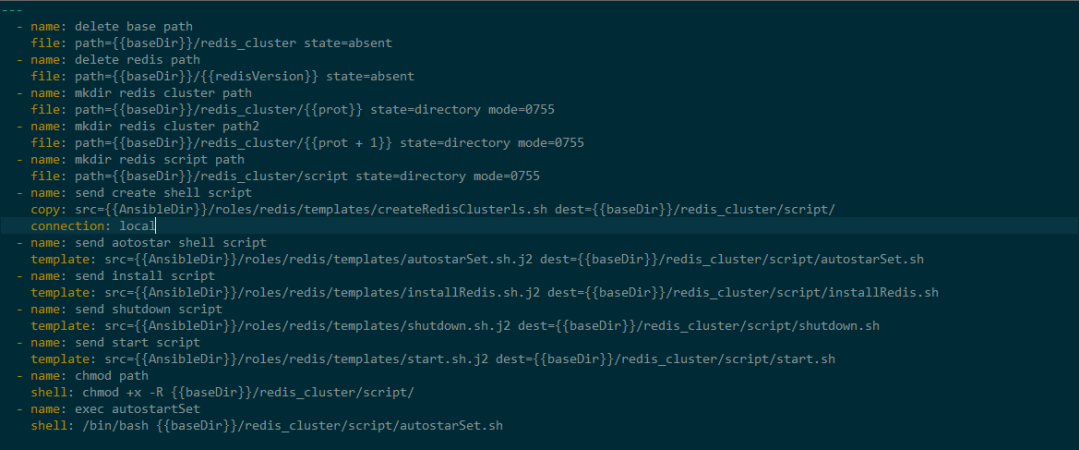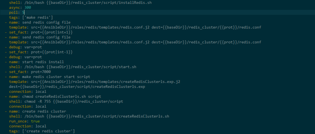 - name: make redisshell: /bin/bash {{baseDir}}/redis_cluster/script/installRedis.shasync: 300poll: 5tags: ['make redis']