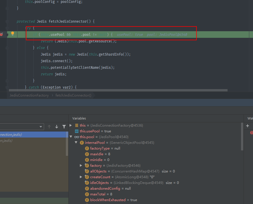 源码跟踪发现,第一次this.userPool为true,连接池已提前创建好