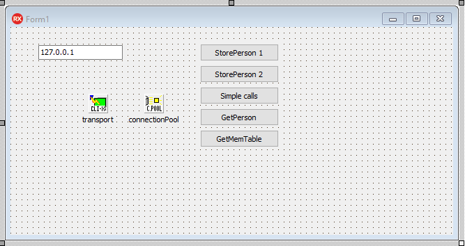 让我们尝试在客户端中使用生成的代码。我们创建了一个基于VCL的标准客户端(kbmMW也可以与Firemonkey一起使用,以便跨平台使用)。我们添加了一个客户端传输(在本例中为TkbmMWTCPIPIndyClientTransport),一个客户端连接池和一些将激活这些调用的按钮。此外,还有一个编辑框,用于键入我们要连接的服务器的IP地址(如果它未在本地主机上运行)。