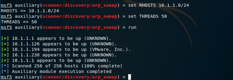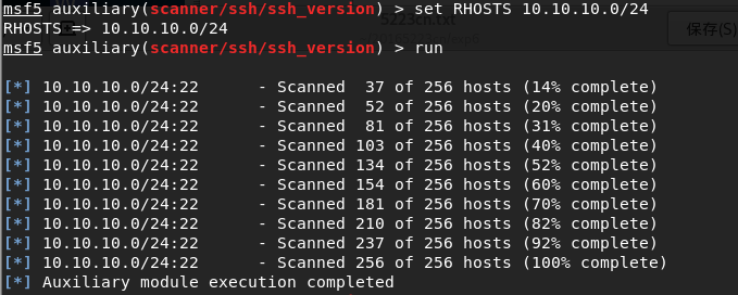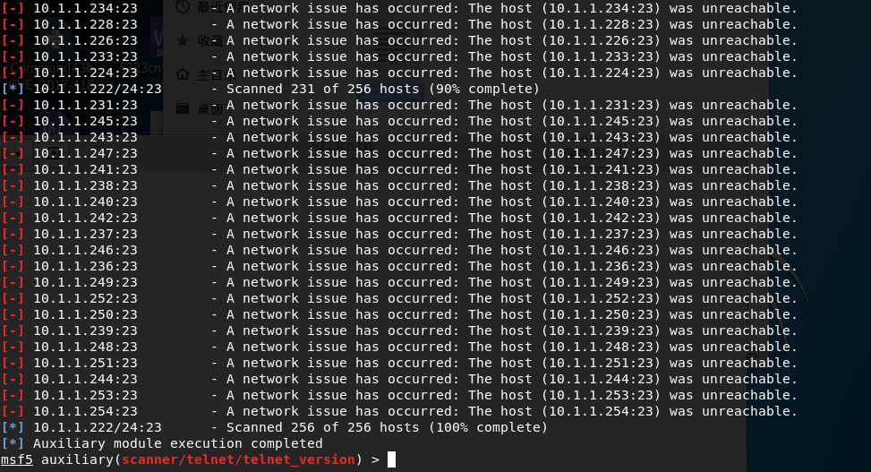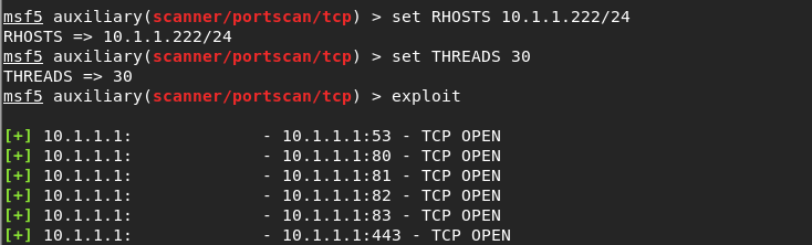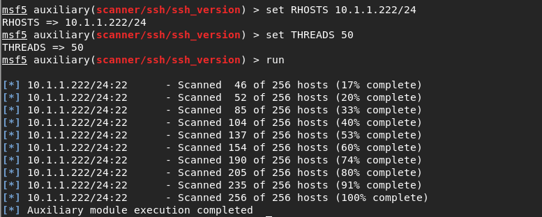 set RHOSTS 10.1.1.222/24 //扫描10.1.1.207/30网段