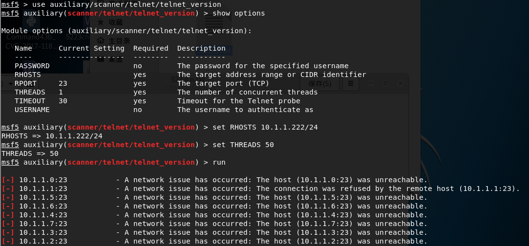 use auxiliary/scanner/telnet/telnet_version //进入telnet模块