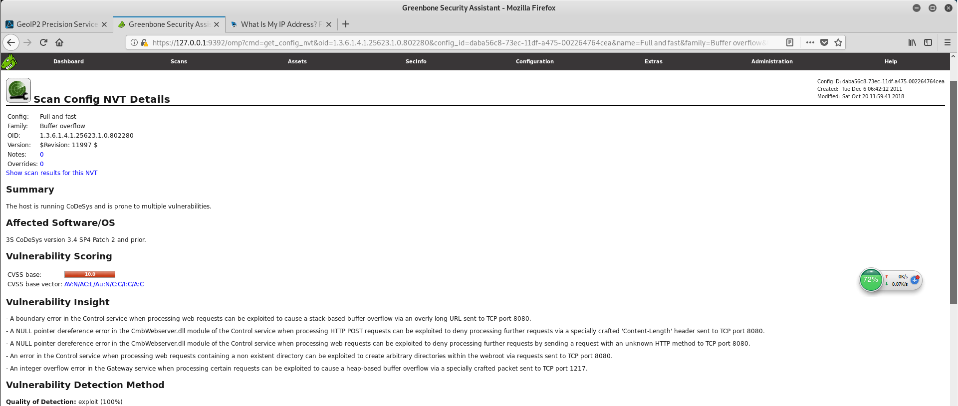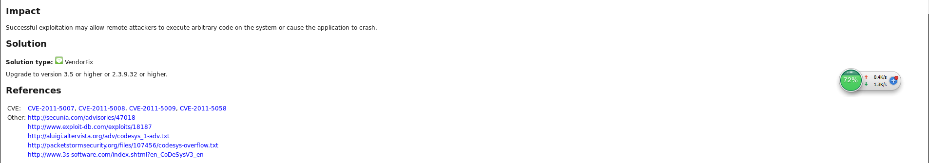 - Summary描述该漏洞:"The host is running CoDesys and is prone to multiple vulerabilities",说明主机此刻正在运行CoDesys这个漏洞,并且容易派生出多个其他漏洞。