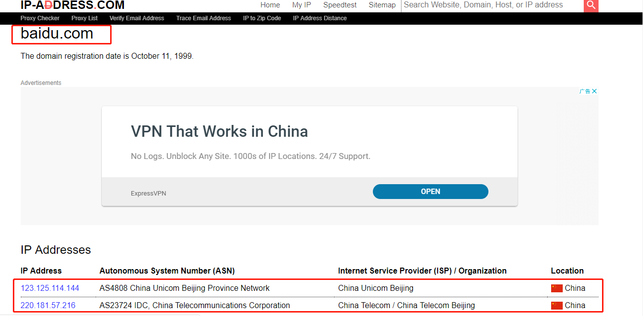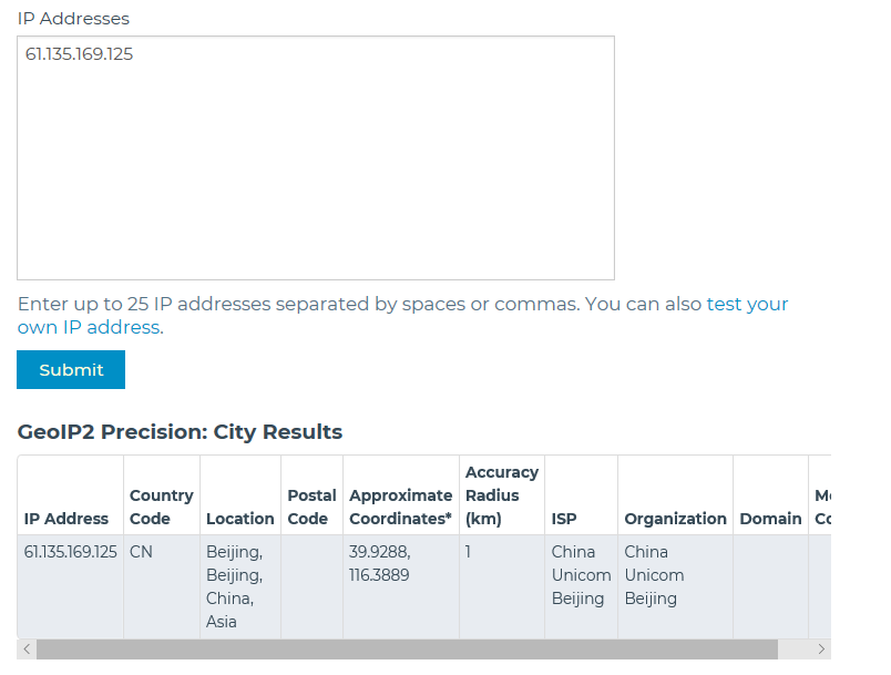 - 输入目的IP域名,可以看到此IP对应的地理位置、编码(ASN)、互联网服务提供商(ISP)等信息