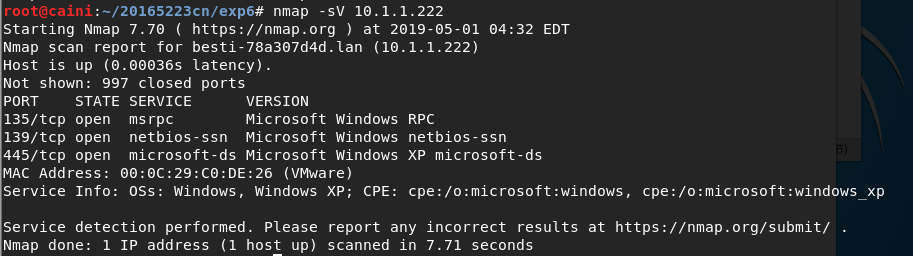 (2)使用nmap -sV 10.1.1.222查看目标主机的详细服务信息