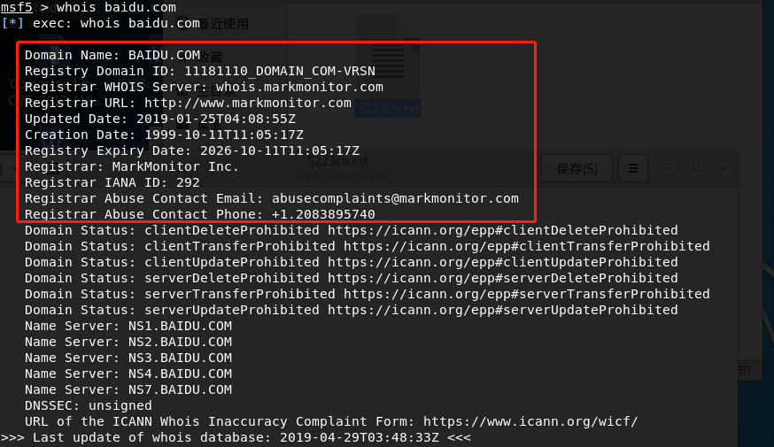 - 注意:进行whois查询时去掉www等前缀,因为注册域名时通常会注册一个上层域名,子域名由自身的域名服务器管理,在whois数据库中可能查询不到