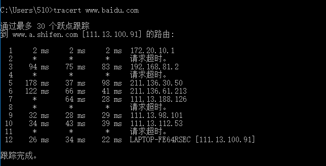 - 带有星号(*)的信息表示该次ICMP包返回时间超时。
