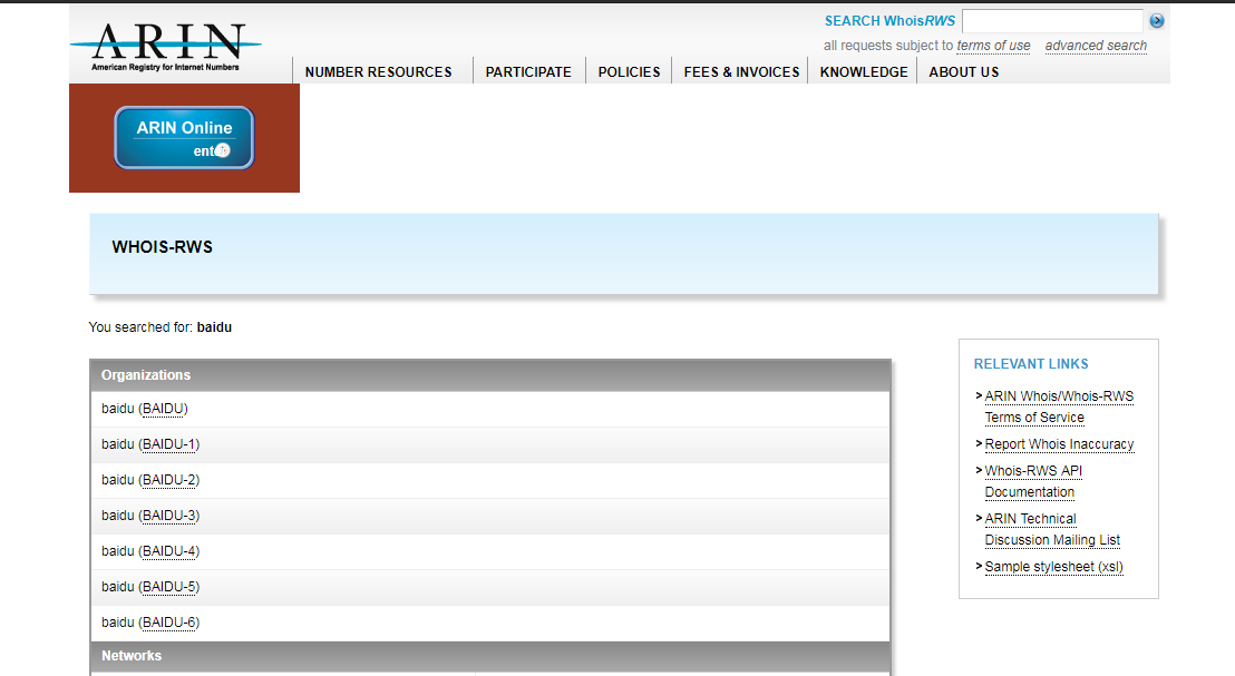 2、IP地址归属信息注册信息查找 (ARIN) , 该组织一共有五个,USA ,Canada 还有 Caribbean 地区,首先查看百度结果截图如下: